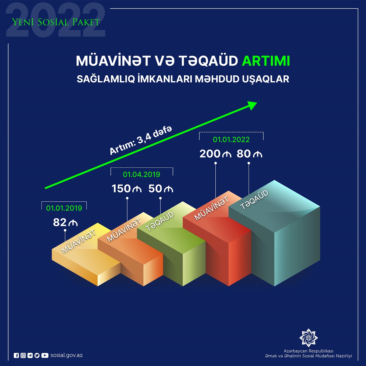 Beləliklə, sağlamlıq imkanları məhdud uşaqlar üçün sosial ödəniş 2019-cu ilin əvvəlində cəmi 82 manat idisə, gələn ilin əvvəlindən həmin məbləğdən 3,4 dəfə çox olmaqla onlar üçün müavinət (200 manat) və təqaüd (80 manat) formasında aylıq 280 manat sosial ödəniş ediləcəkdir.