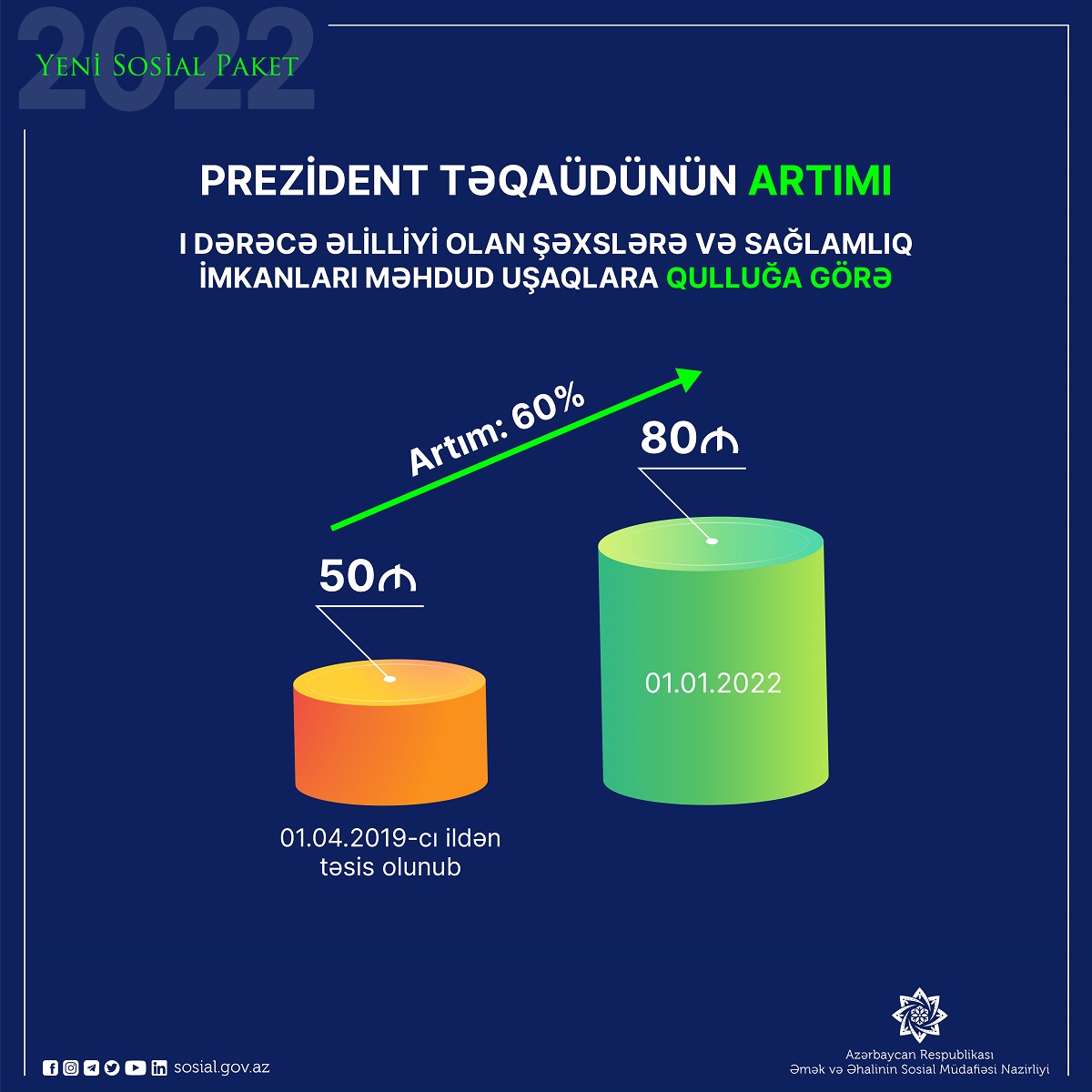 Birinci dərəcəəlilliyi olan şəxslərə qulluğa görə Prezidentin aylıq təqaüdü də 60% artırılaraq gələn ilin əvvəlindən 80 manata çatdırılır.