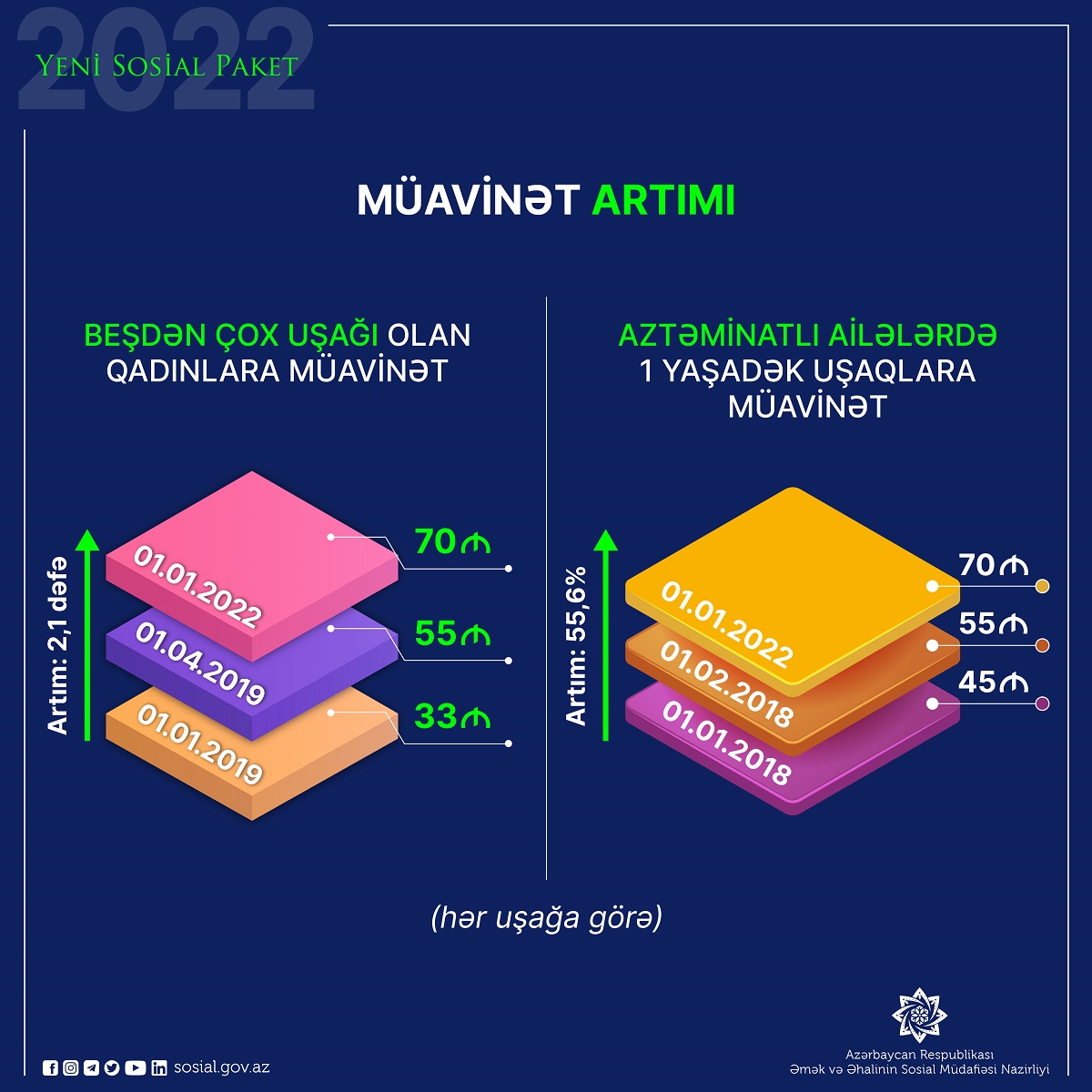 Bir yaşınadək uşağı olan aztəminatlı (ünvanlı dövlət sosial yardımı təyin edilmiş) ailələrə hər uşağa görə müavinət isə yeni Fərmanla 55 manatdan 70 manata çatdırılıb. Bununla da həmin uşaqlar üçün müavinətdə üç il əvvələ (45 manat) nisbətən 55,6% artım baş verir.