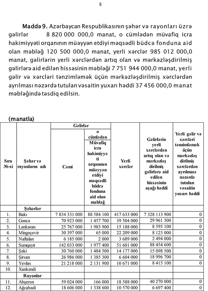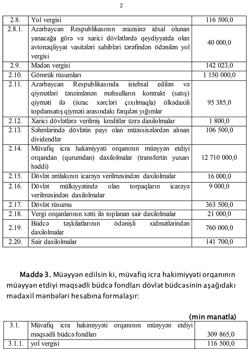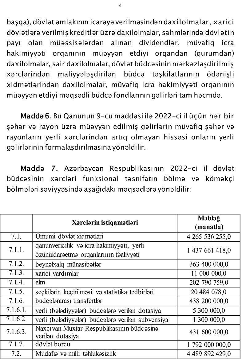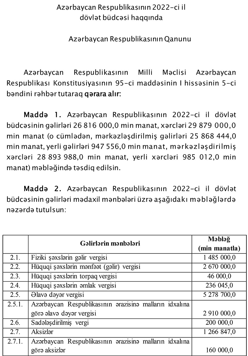 Marja xəbər verir ki, Azərbaycan Respublikasının 2022-ci il dövlət büdcəsinin gəlirləri 26 milyard 816 milyon manat, xərcləri 29 milyard 879 milyon manat (o cümlədən, mərkəzləşdirilmiş gəlirləri 25 milyard 868 milyon 444 min manat, yerli gəlirləri 947 milyon 556 min manat, mərkəzləşdirilmiş xərcləri 28 milyard 893 milyon 988 min manat, yerli xərcləri 985 milyon 12 min manat) məbləğində təsdiq edilib.