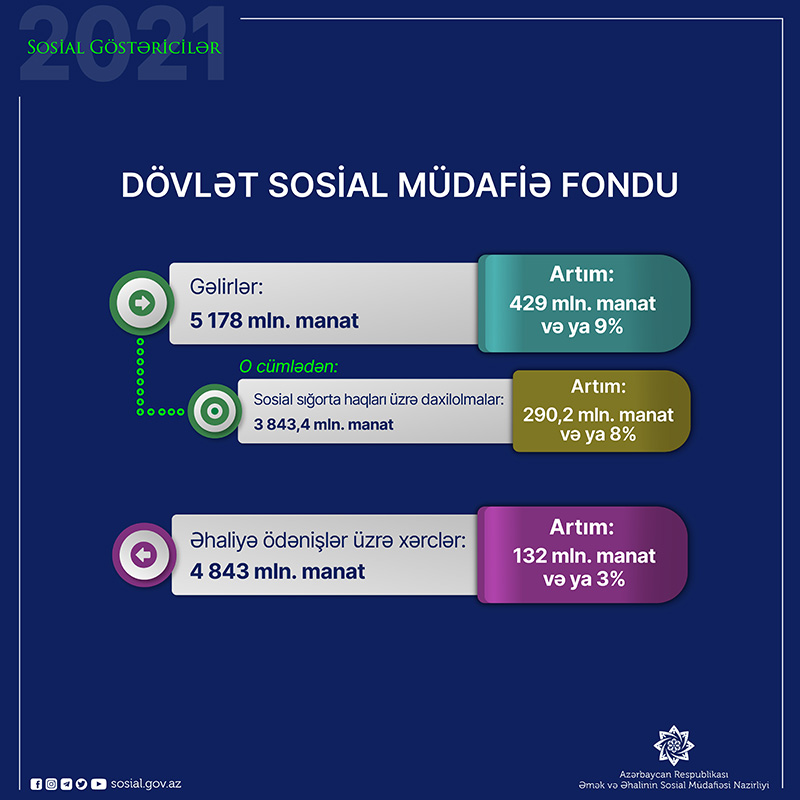 Qeyd edilib ki. Fondun gəlirləri tərkibində məcburi dövlət sosial sosial sığorta daxilolmaları ötən il 3843,4 milyon manat olub ki, bu da əvvəlki ilə nisbətən 290,2 milyon manat və ya 8% çoxdur.