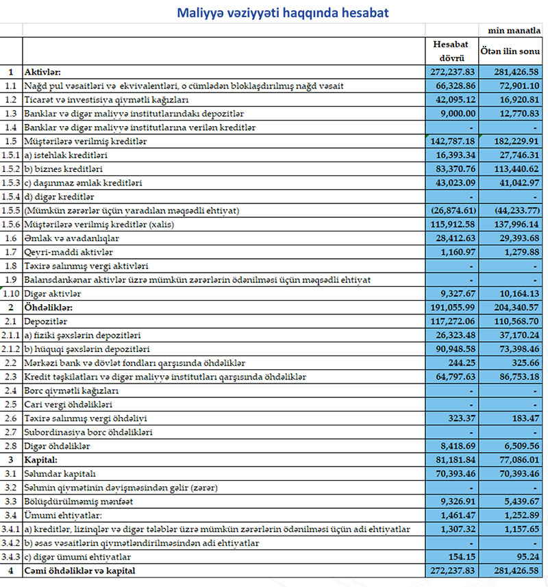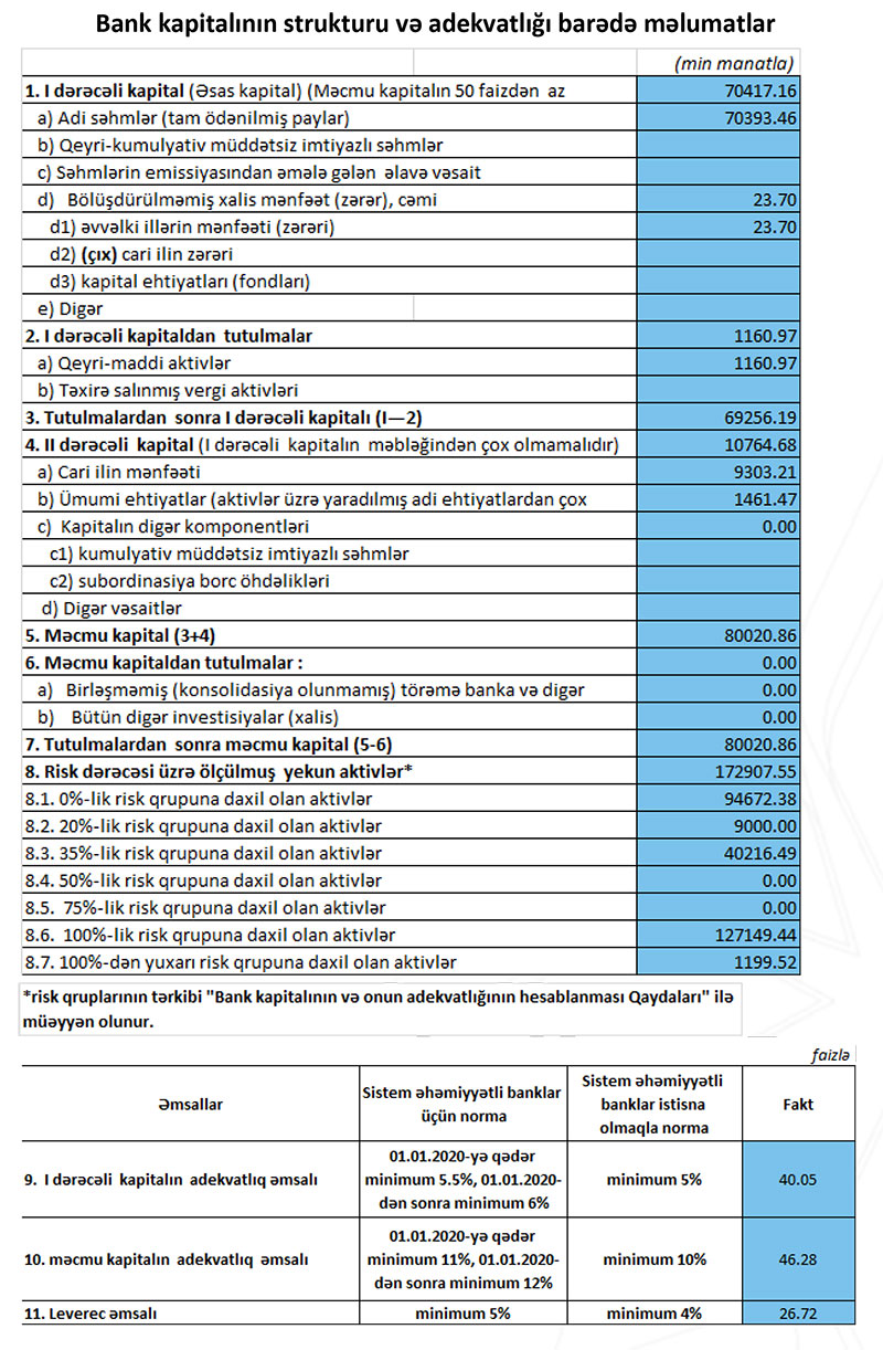 31 dekabr 2021-ci il tarixində 80 milyon 21 min manat məcmu kapitala malik olub. Bank 31 dekabr 2020-ci il tarixində 75 milyon 806 min manat cəmi kapitala malik idi.