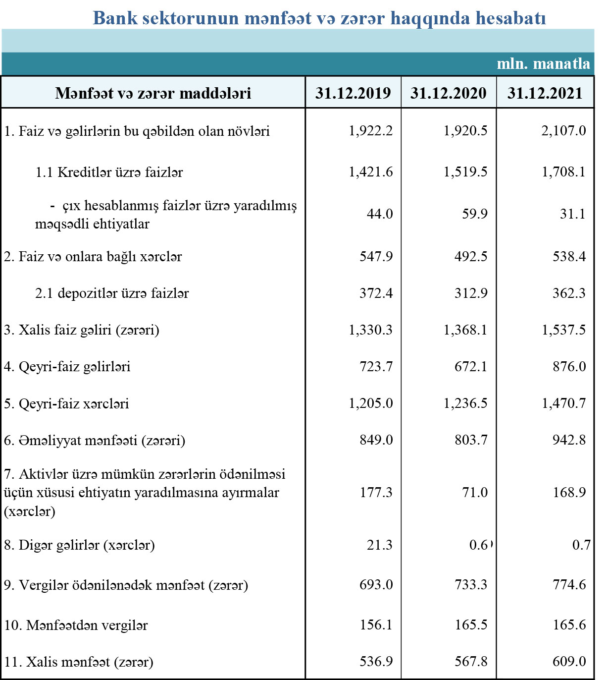 Azərbaycanın bank sektoru 2021-ci ili 609 milyon manat xalis mənfəət ilə başa vurub.