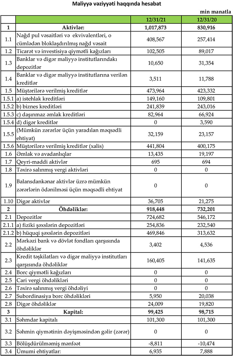 “Rabitəbank”da depozitlər 2020-ci illə müqayisədə 2021-ci ildə 178 milyon 510 min manat və ya 32,7% artaraq 724 milyon 682 min manata çatıb.