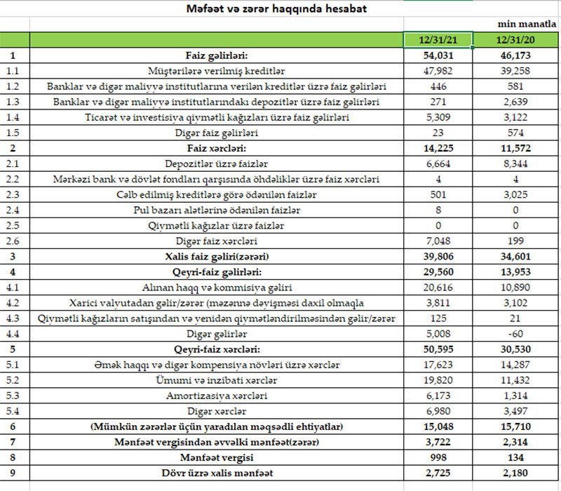 “Rabitəbank”ın faiz gəlirləri 2020-ci illə müqayisədə 2021-ci ildə 7 milyon 858 min manat və ya 17% artaraq 54 milyon 31 min manat, qeyri-faiz gəlirləri isə 15 milyon 607 min manat və ya 112% artaraq 29 milyon 560 min manat təşkil edib.