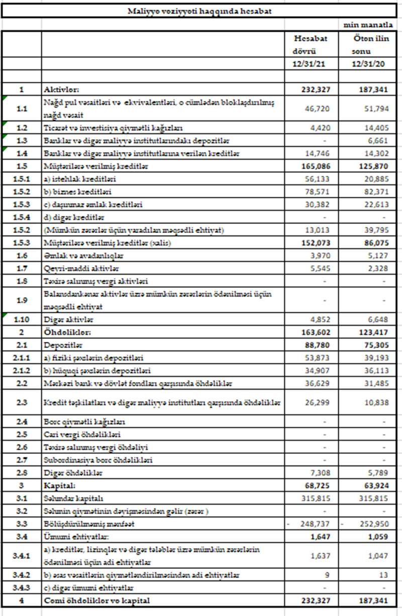 Bankın yaydığı press-relizə görə, hesabat dövründə bankın kredit portfeli 31,2% artaraq 165 milyon 86 min manata çatıb. Bankın istehlak kreditləri üzrə portfeli 56 milyon 133 min manat (iki dəfə artım), biznes kreditləri üzrə portfeli 78 milyon 571 min manat (4,6% azalma) təşkil edib.