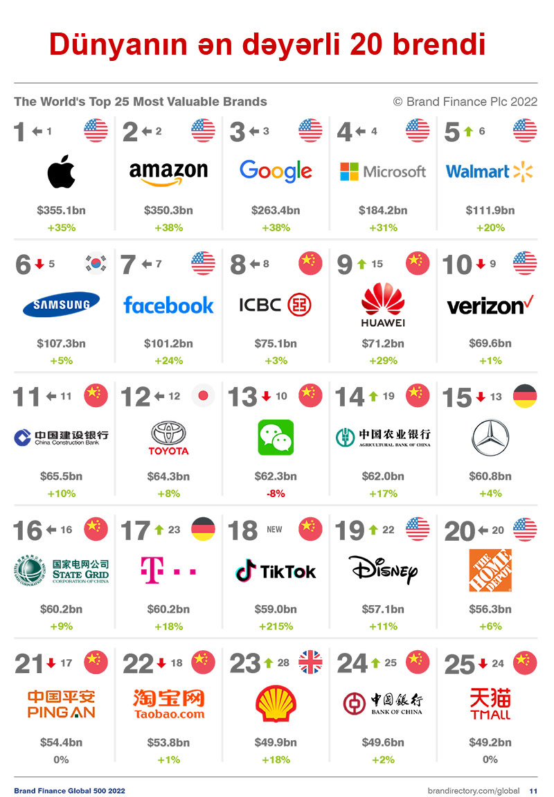 “Brand Finance” beynəlxalq reytinq agentliyi Dünyanın ən dəyərli və güclü brendlərinin illik hesabatını - “Qlobal 500-2022”ni dərc edib.