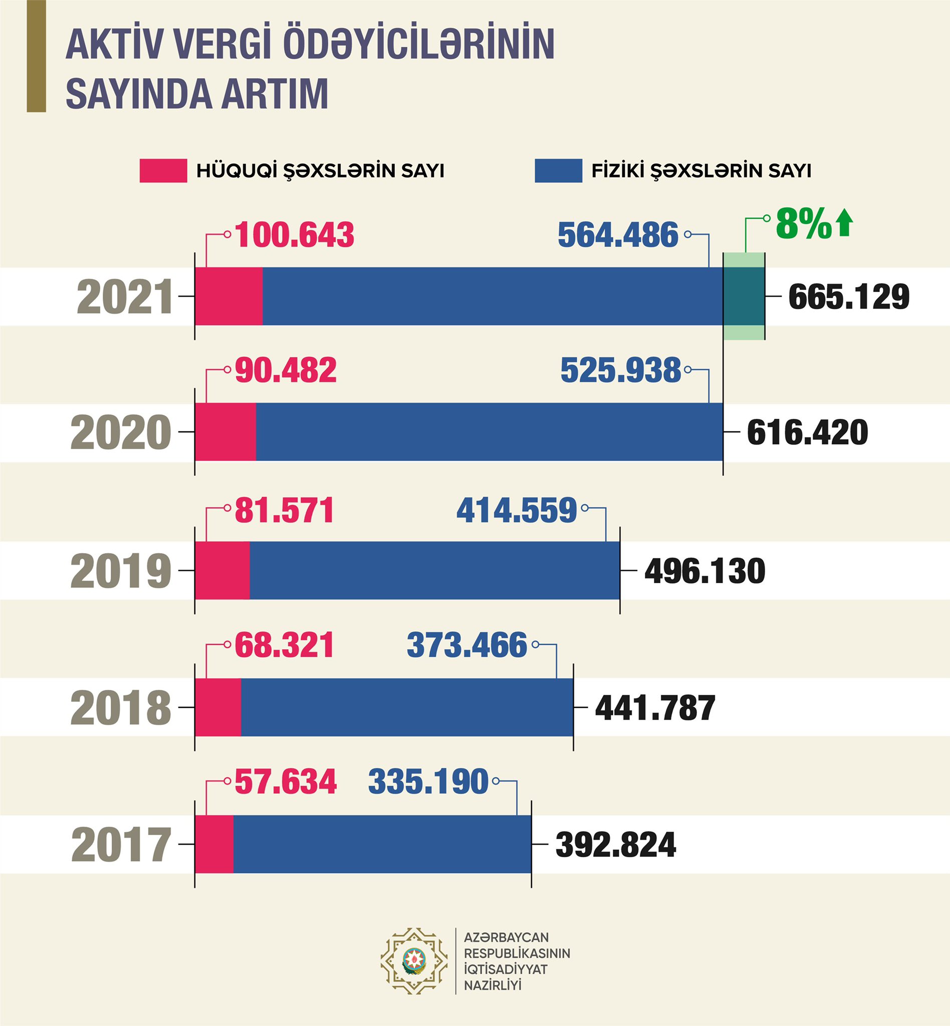 Nazir qeyd edib ki, vergi ödəyicilərinin sayı 665 mini ötüb. Aktiv hüquqi şəxslərin sayı ilin sonuna 100 mini keçib.