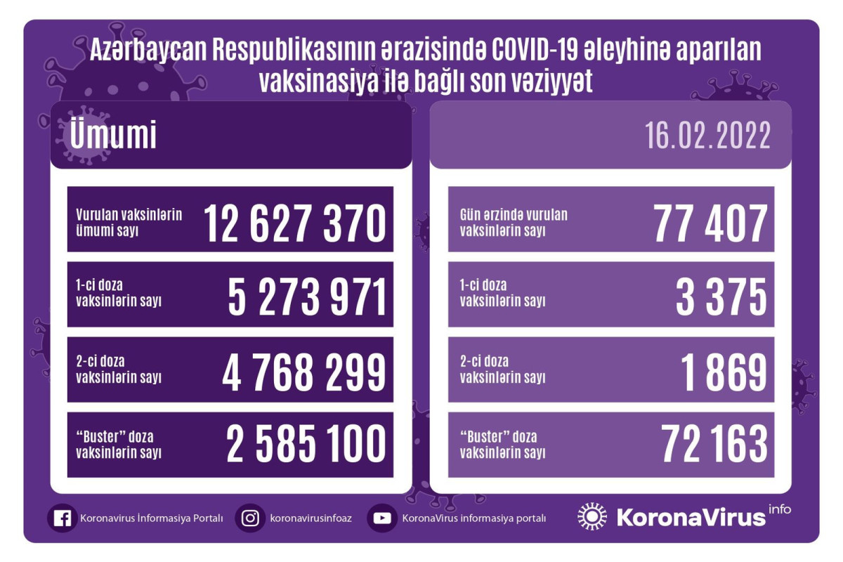 Birinci mərhələ üzrə vaksinasiya olunanların sayı 3 375, ikinci mərhələ üzrə vaksinasiya olunanların sayı 1 869, buster doza üzrə vaksinasiya olunanların sayı isə 72 163 nəfərdir.