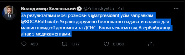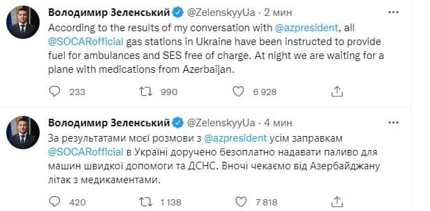 "Azərbaycan Prezidenti İlham Əliyev ilə söhbətimin nəticələrinə görə, SOCAR-ın Ukraynadakı bütün yanacaqdoldurma məntəqələrinin Ukraynada təcili yardım maşınlarına və Ukraynanın Fövqəladə Xidməti üçün pulsuz yanacaq verməsi tapşırılıb. Gecə Azərbaycandan dərmanlarla gələn təyyarəni gözləyirik".