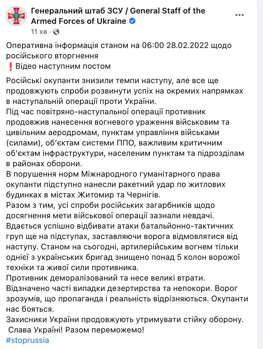 İşğalçılar beynəlxalq humanitar hüquq normalarını pozaraq məkrli şəkildə Jitomir və Çerniqov şəhərlərində yaşayış binalarına raket zərbələri endiriblər.