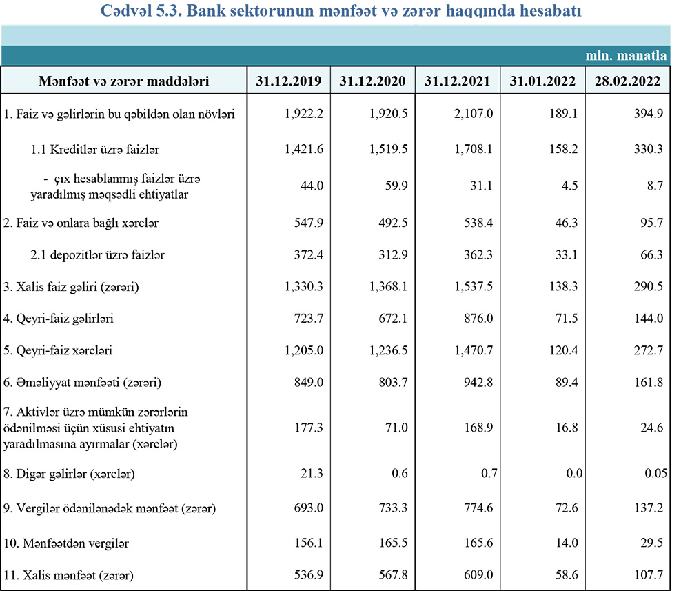 Azərbaycanın bank sektoru 2022-ci ilin yanvar-fevral dövrünü 107,7 milyon manat xalis mənfəət ilə başa vurub. Sektroun xalis mənfəəti ötən ilin eyni dövrü ilə müqayisədə 34,6 milyon manat və ya 47,3% artıb. Bank sektoru 2021-ci ilin yanvar-fevral dövrünü 73.1 milyon manat xalis mənfəət ilə bağlamışdı.
