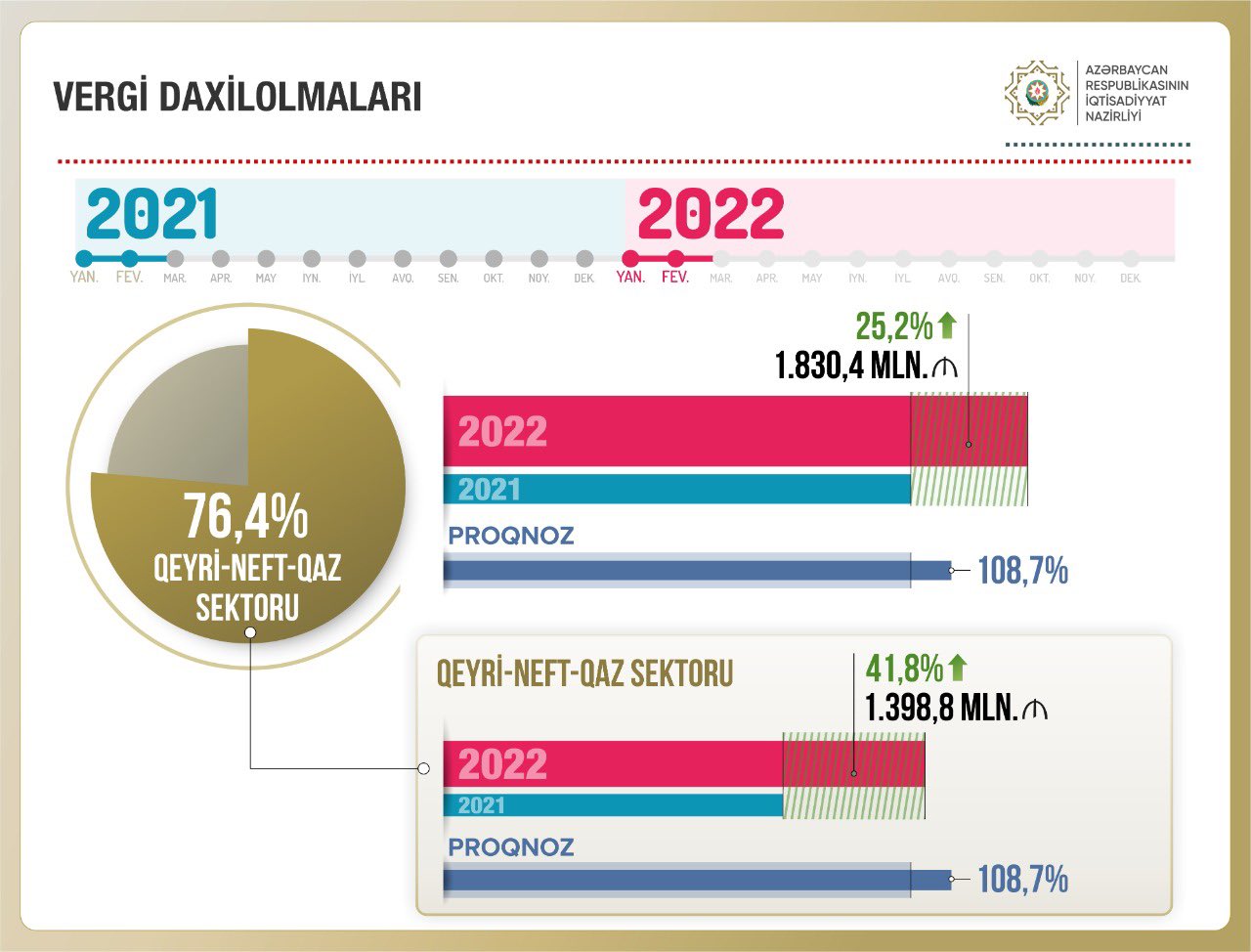2022-ci ilin yanvar-fevral aylarında vergi daxilolmaları ötən ilin eyni dövrü ilə müqayisədə 25,2% artaraq 1 milyard 830,4 milyon manat təşkil edib və proqnoz 108,7% səviyyəsində icra olunub.