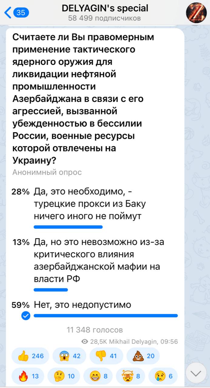 Xatırladaq ki, M. Delyaqin öz rəsmi teleqram kanalında Azərbaycanla bağlı sorğu yerləşdirərək izləyicilərdən Azərbaycanın neft sənayesinin məhv edilməsi üçün taktiki nüvə silahından istifadə olunmasını düzgün hesab edib-etmədiklərini soruşub.