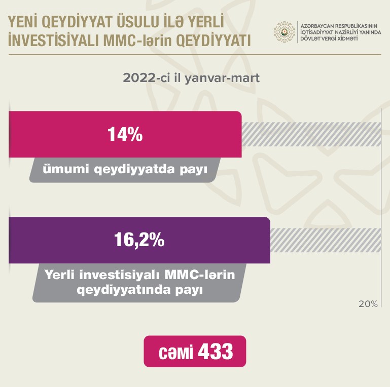 Yerli investisiyalı məhdud məsuliyyətli cəmiyyətlərin e-qeydiyyatının xüsusi çəkisi 95,1% təşkil edib2022-ci il aprelin 1-nə respublika üzrə uçotda olan 1 milyon 360 min 747 vergi ödəyicisinin 87,9%-i fiziki şəxslər, 12,1%-i hüquqi şəxslər və digər təşkilatlar olub.