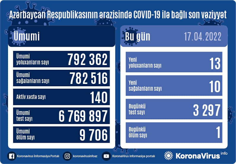 Məlumata görə, COVID-19 üçün götürülən analiz nümunələri müsbət çıxmış şəxslər arasında 1 nəfər vəfat edib.