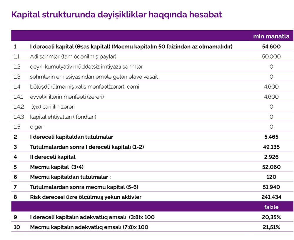 Bankın məcmu kapitalının həcmi 3,5% artaraq 52 milyon manata çatıb. Məcmu kapitalın adekvatlığı 21%, leverec əmsalı 11% səviyyəsində olmuşdur ki, bu da müəyyən edilmiş normadan yüksəkdir.