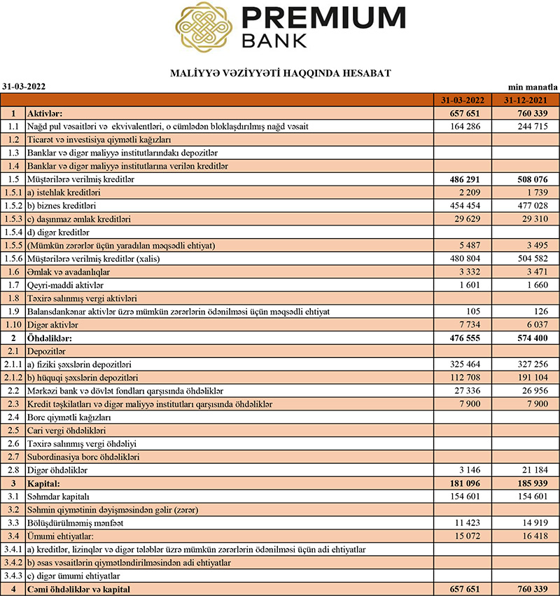 31 Mart 2022-ci il tarixində "Premium Bank" 657 milyon 651 min manat cəmi aktivlərə malik olub. Bank 2021-ci ilin sonunda 760 milyon 339 min manat cəmi aktivlərə malik idi.