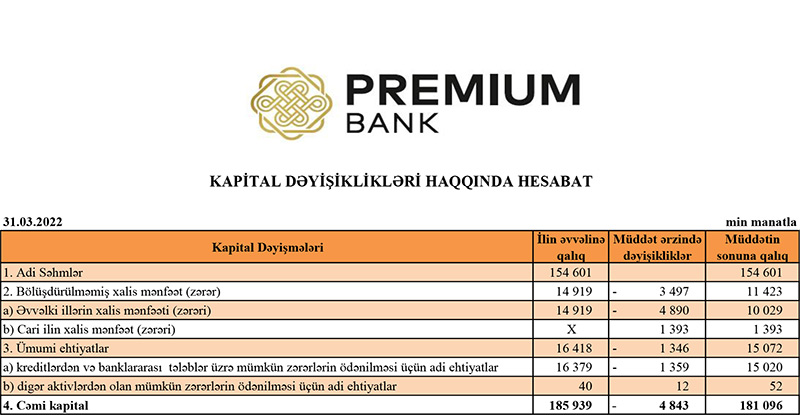 31 Mart 2022-ci il tarixində "Premium Bank" 171 milyon 95 min manat məcmu kapitala malik olub.