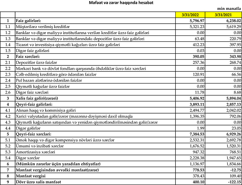 İlk rübdə Bankın biznes kreditləri portfeli 16 milyon 65 min manat aratarq 31 mart 2022-ci il tarixində 133 milyon 321 min manat təşkil edib.