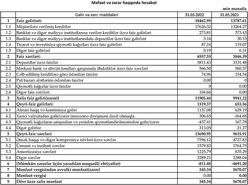 Eyni zamanda hesabat dövrü üzrə Bankın xalis faiz gəlirləri 12 milyon manat olub. Bu da ötən ilin analoji dövrü ilə müqayisədə 20% artım deməkdir.