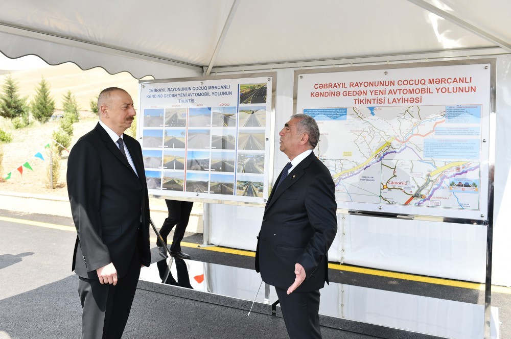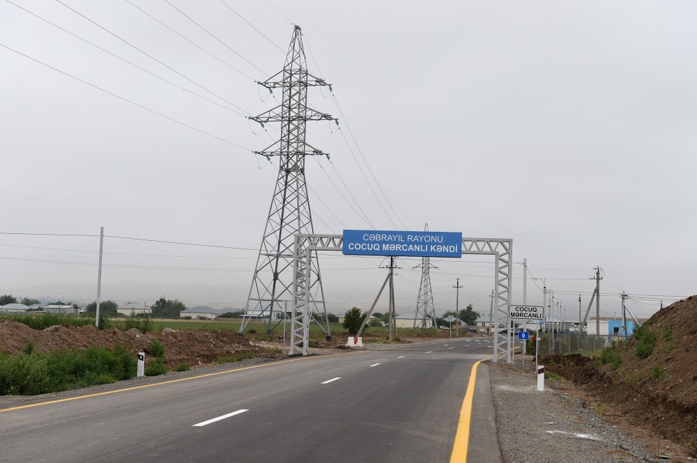 Azərbaycan Prezidenti İlham Əliyevin Cəbrayıl rayonunun Cocuq Mərcanlı kəndinə səfəri yeni salınan kənd yolunun açılışı ilə başladı. Dövlətimizin başçısına məlumat verildi ki, yolun ümumi uzunluğu 9 kilometr, eni 12 metrdir. İki hərəkət zolaqlı yolun tikintisi Prezident İlham Əliyevin bu ilin fevralında imzaladığı “Cəbrayıl rayonunun Cocuq Mərcanlı kəndinə gedən avtomobil yolunun tikintisi ilə bağlı əlavə tədbirlər haqqında” Sərəncama əsasən həyata keçirilib. Strateji əhəmiyyəti ilə seçilən bu yolun inşası zamanı zəruri olan yerlərdə su keçidləri tikilib, uzunluğu 24 metr olan ikiaşırımlı mövcud körpü bərpa edilib. Yol üzərində 76 yol nişanı və məlumatverici lövhələr quraşdırılıb, piyada zolaqları, yol-cizgi və yolgöstərici xətləri çəkilib.