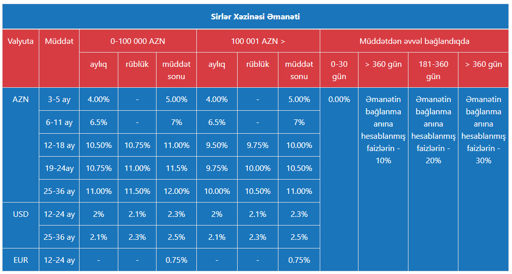 Həmçinin, "Sirlər Xəzinəsi Əmanəti" məhsulu üzrə maksimal faiz 12%-ə çatdırılıb. Belə ki, əmanətini 25-36 ay müddətinə banka yerləşdirənlərə - faiz aylıq ödənildikdə 11%, rüblük ödənildikdə 11.50%, müddətin sonunda ödənildikdə isə 12% gəlir təklif olunur.