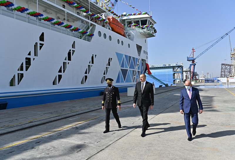 Prezident İlham Əliyev gəmi-bərənin istismara verilməsini bildirən rəmzi lenti kəsib.