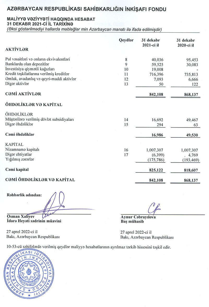 Yerli biznesi güzəştli kreditlər ilə maliyyələşdirən Azərbaycan Respublikası Sahibkarlığın İnkişafı Fondu 2021-ci ili 17 milyon 683 min manat xalis mənfəət ilə başa vurub. Halbuki, Fond 2020-ci ili 32 milyon 229 min manat xalis zərər ilə bağlamışdı.