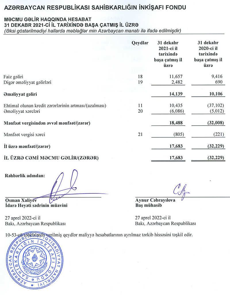Ötən ilin mənfəəti ilə əlaqədar olaraq Fondun yığılmış zərəri 193 milyon 469 min manatdan 175 milyon 786 min manata düşüb.