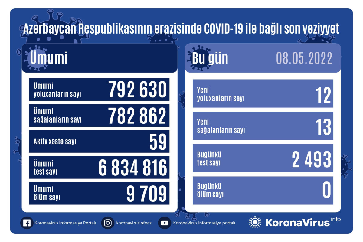Azərbaycan Respublikasında koronavirus (COVID-19) infeksiyasına 12 yeni yoluxma faktı qeydə alınıb, 13 nəfər müalicə olunaraq sağalıb.