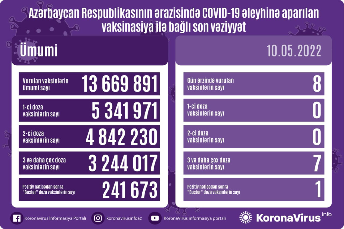 Azərbaycanda son sutkada koronavirus (COVID-19) əleyhinə 8 vaksin vurulub. Birinci doza üzrə vaksinasiya olunanların sayı 0, ikinci mərhələ üzrə vaksinasiya olunanların sayı 0, üç və daha çox doza üzrə vaksinasiya olunanların sayı 7, pozitiv nəticədən sonra buster doza üzrə vaksinasiya olunanların sayı 1 nəfərdir.