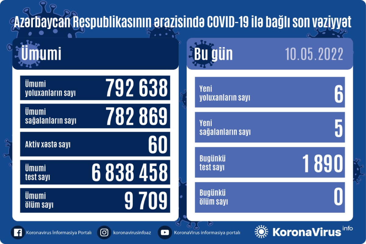 Azərbaycan Respublikasında koronavirus (COVID-19) infeksiyasına 6 yeni yoluxma faktı qeydə alınıb, 5 nəfər müalicə olunaraq sağalıb.