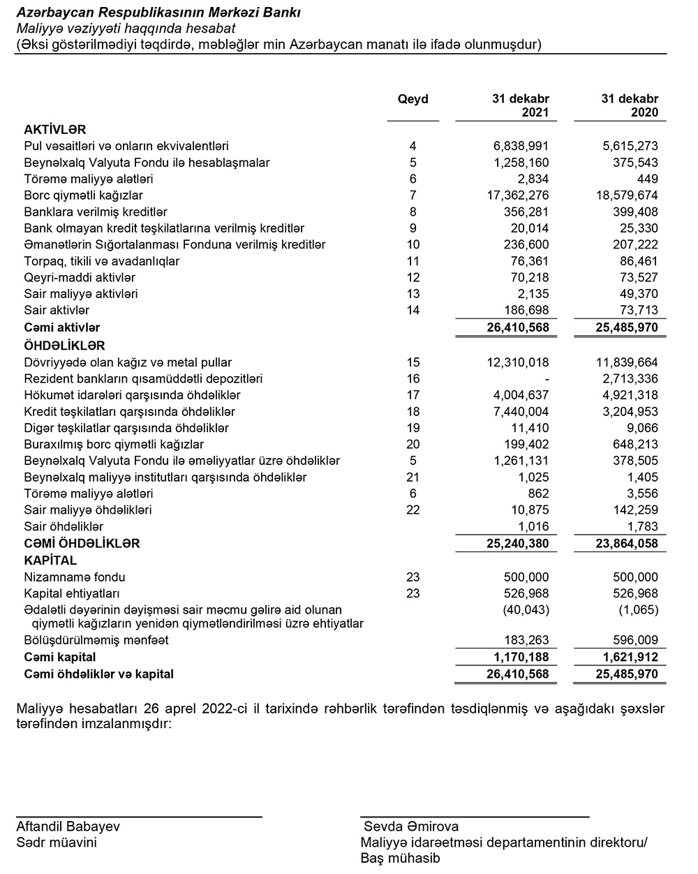 Mərkəzi Bankın cəmi aktivləri 2020-ci illə müqayisəıdə 2021-ci ildə 924 milyon 598 min manat və ya 3,6% artaraq 26 milyard 410 milyon 568 min manata çatıb.