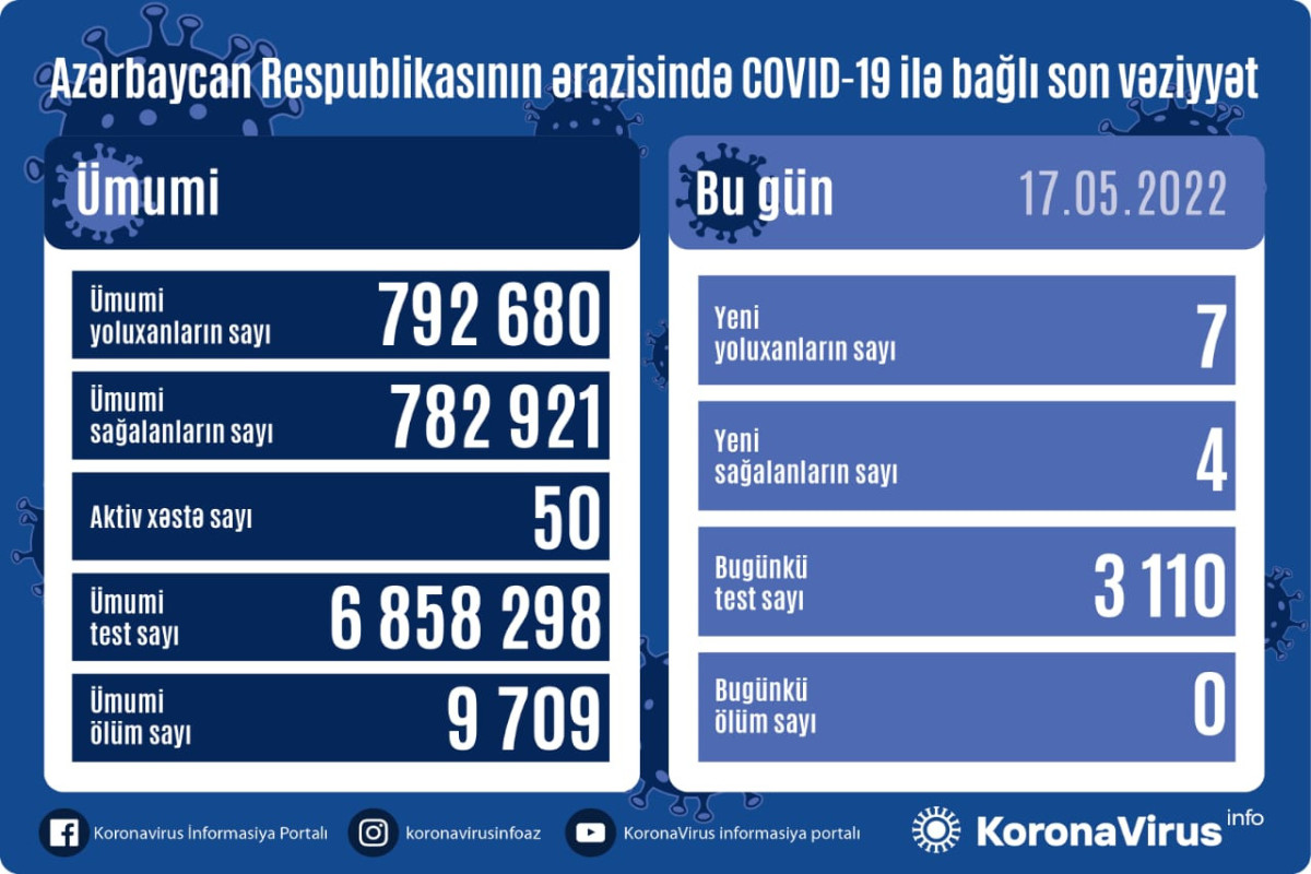 Azərbaycanda koronavirus (COVID-19) infeksiyasına 7 yeni yoluxma faktı qeydə alınıb, 4 nəfər müalicə olunaraq sağalıb.