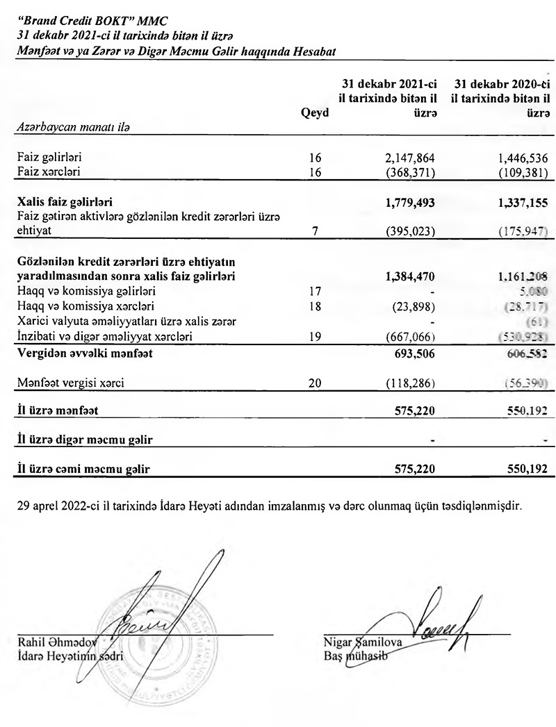 Marja.az xəbər verir ki, "Brand Credit BOKT"un faiz gəlirləri 2020-ci ildə 1 milyon 446 min 536 manat ikən, 2021-ci ildə 2 milyon 147 min 864 manata yüksəlib (701 min 328 manat və ya 48,5% artıb)