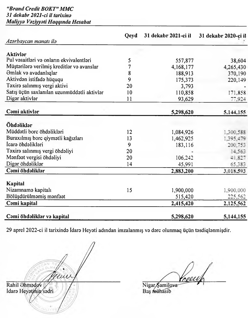 2020-ci illə müqayisədə 2021-ci ildə "Brand Credit BOKT"un kredit portfeli (müştərilərə verilmiş kreditlər) 2,3% azalaraq 4 milyon 168 min 177 manata düşüb.