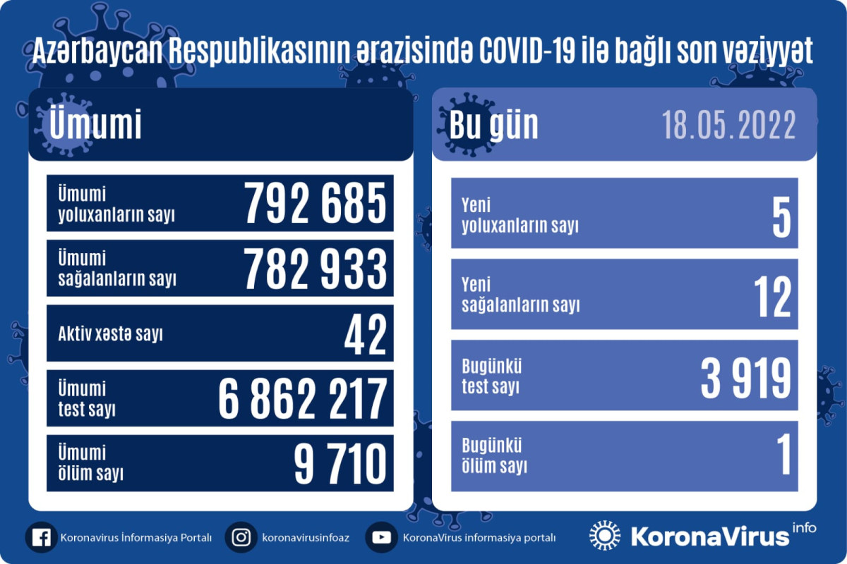 Azərbaycanda koronavirus (COVID-19) infeksiyasına 5 yeni yoluxma faktı qeydə alınıb, 12 nəfər müalicə olunaraq sağalıb.