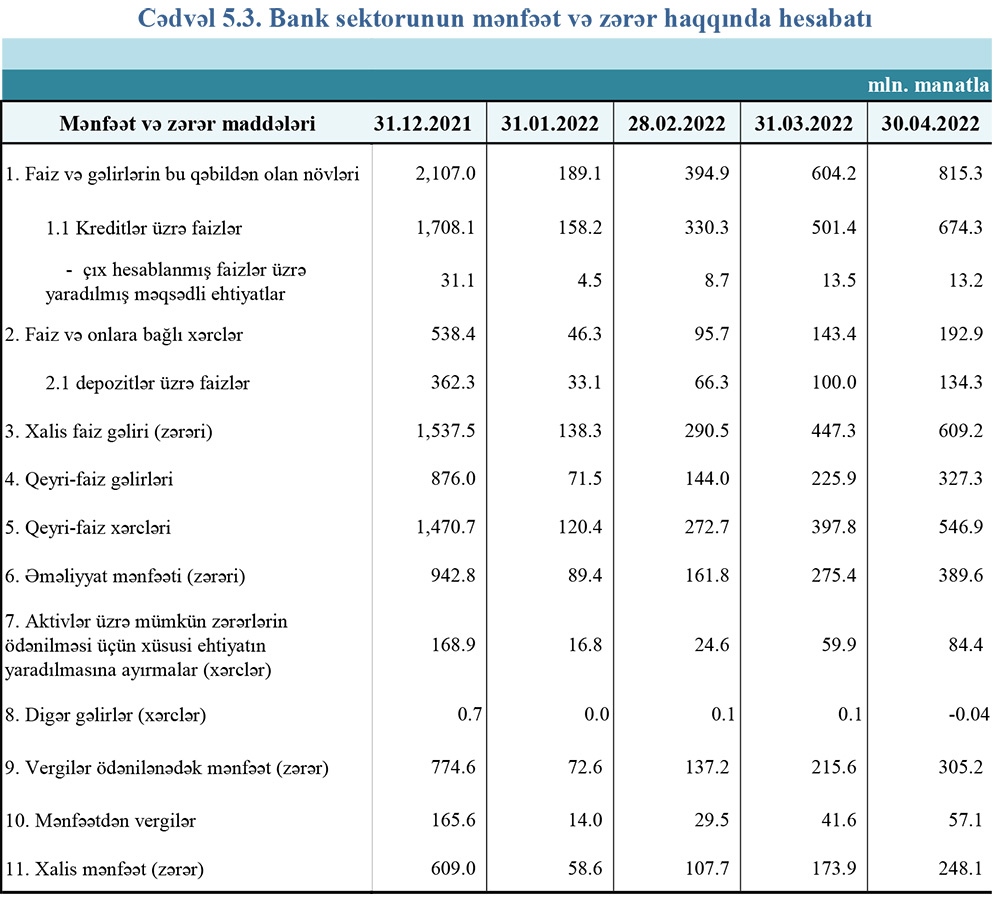 · 2022-ci ilin yanvar-aprel aylarında banklar 248.1 milyon manat xalis mənfəət, 389.6 milyon manat məbləğində əməliyyat mənfəəti əldə etmişlər. İlin əvvəlindən banklar tərəfindən ümumilikdə 57.1 milyon manat məbləğində mənfəət vergisi ödənilmişdir (ötən ilin müvafiq dövrü ilə müqayisədə 31.5% və ya 13.7 milyon manat daha çox).