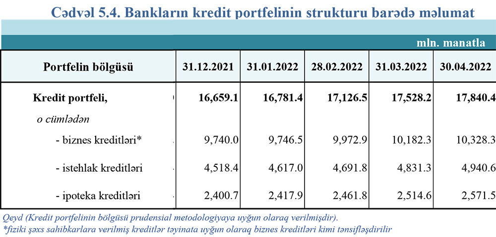 · Kredit portfeli aprel ayında 1.8% (312,2 milyon manat) artaraq 17 milyard 840.4 milyon manat olmuşdur. Bankların cəmi kredit portfelində biznes kreditlərinin payı 57.9% (10 milyard 328.3 milyon manat) təşkil etmişdir. Ümumilikdə, cari ilin 4 ayında kredit portfelinin artımının 50%-i biznes, 36%-i istehlak, 14%-i isə ipoteka kreditəri hesabına olmuşdur.