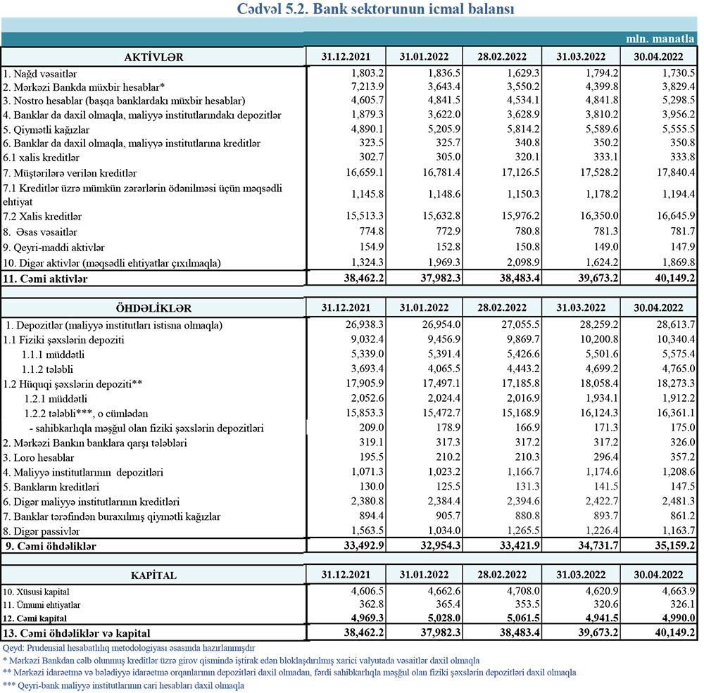 · Fəaliyyətdə olan bankların cəmi aktivləri 40 milyard 149.2 milyon manat, cəmi öhdəlikləri 35 milyard 159.2 milyon manat, balans kapitalı 4 milyard 990 milyon manat olmuşdur. 2022-ci ilin aprel ayında bankların cəmi aktivləri, cəmi öhdəlikləri və balans kapitalı müvafiq olaraq 1.2%, 1.2% və 1% artmışdır.