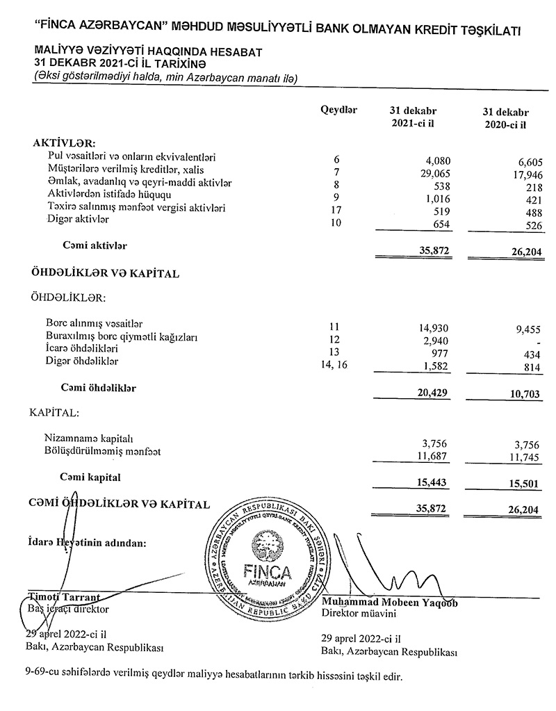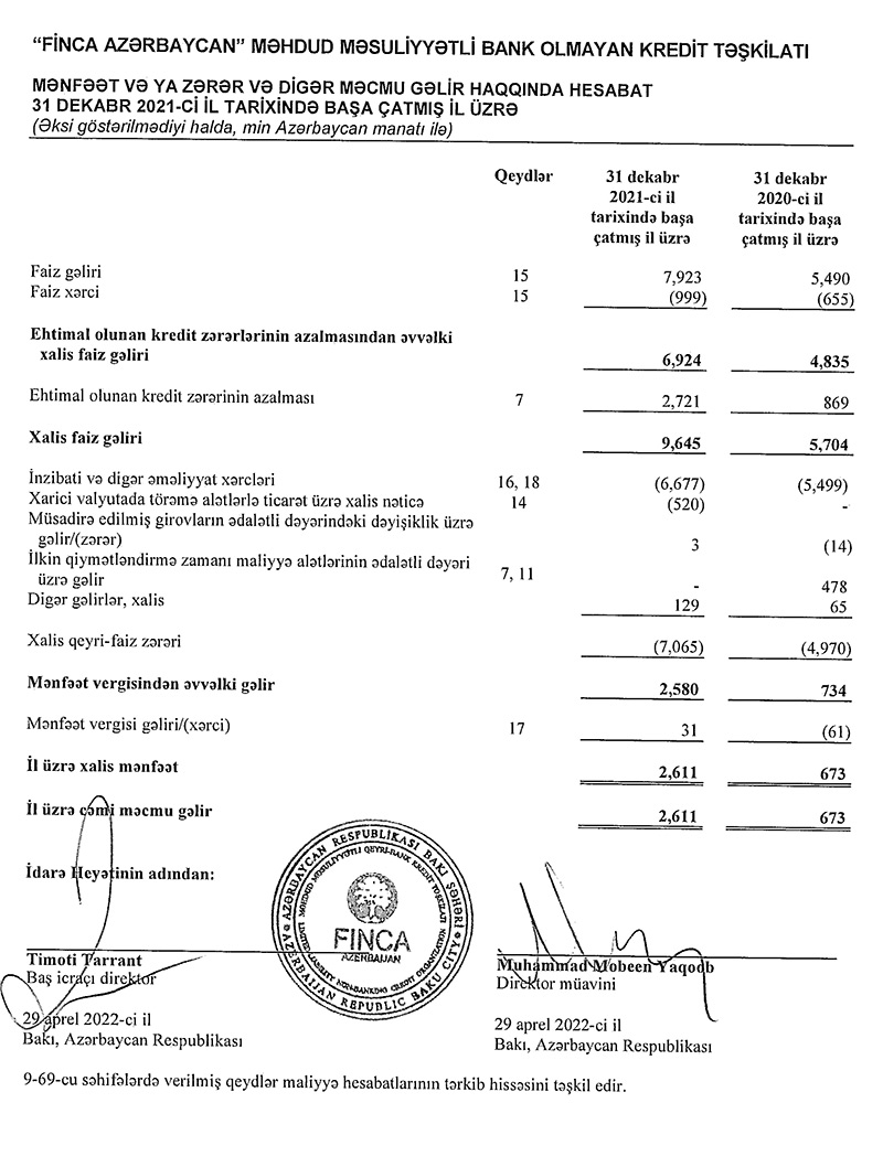 Bank Olmayan Kredit Təşkilatı "Finca Azərbaycan" MMC 2021-ci ili 2 milyon 611 min manat xalis mənfəət ilə başa vurub. Təşkilat 2020-ci ili 673 min manat xalis mənfəət ilə bağlamışdı. Beləliklə, 2020-ci illə müqayisədə 2021-ci ildə "Finca Azərbaycan"ın xalis mənfəəti 3,9 dəfə artıb.