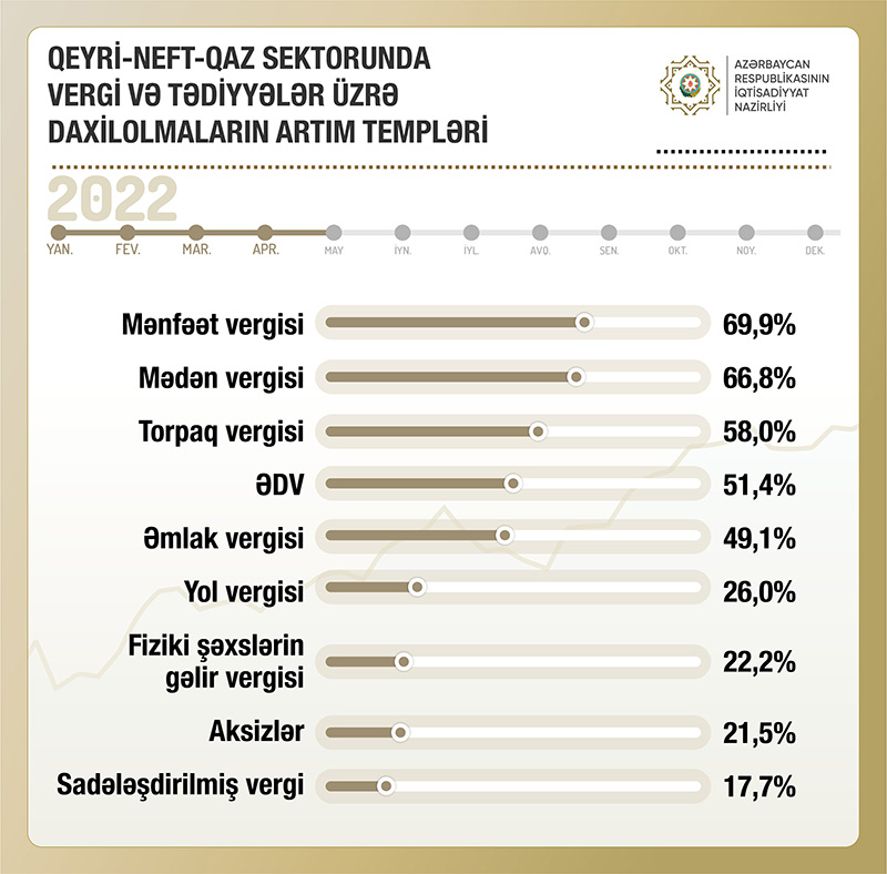 2022-ci ilin yanvar-aprel aylarında qeyri-neft sektorunun özəl bölməsi üzrə vergi daxilolmaları ötən ilin müvafiq dövrü ilə müqayisədə 44,7%, neft sektorunda xarici və yerli subpodratçıların vergiləri istisna olmaqla, özəl sektordan daxilolmalar 45% artıb.