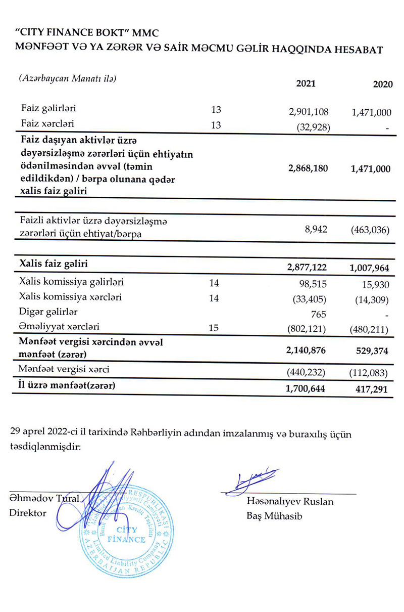 Marja.az xəbər verir ki, "City Finance"ın faiz gəlirləri 2020-ci ildə 1 milyon 471 min manat ikə, 2021-ci ildə 2 milyon 901 min manata yüksəlib (təxminən 2 dəfə artıb).