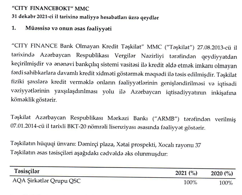 "City Finance BOKT"un təsisçisi (100%) "AQA Şirkətlər Qrupu" QSC-dir.
