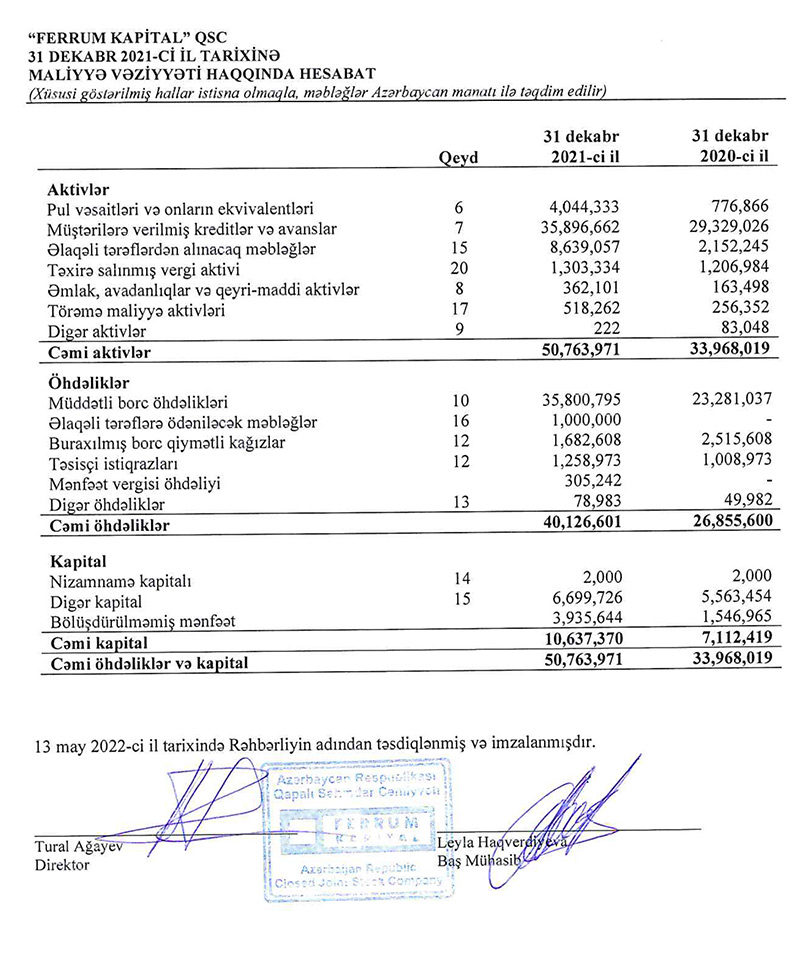 Ötən ilin sonunda "Ferrum Kapital" tərəfindən müştərilərə verilmiş cəmi kreditlər və avanslar 35 milyon 897 min manat təşkil edib. 2020-ci ilin sonunda bu rəqəm 29 milyon 329 min manat idi. Beləliklə, şirkətin kredit portfeli 22,4% artıb.