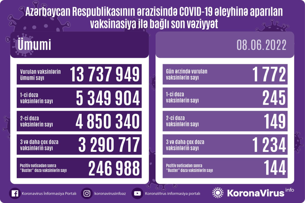 Nazirlər Kabineti yanında Operativ Qərargahdan APA-ya verilən məlumata görə, bir gündə birinci mərhələ üzrə vaksinasiya olunanların sayı 245, ikinci mərhələ üzrə vaksinasiya olunanların sayı 149, üç və daha çox doza üzrə vaksinasiya olunanların sayı 1234, pozitiv nəticədən sonra buster doza üzrə vaksinasiya olunanların sayı 144 nəfərdir.