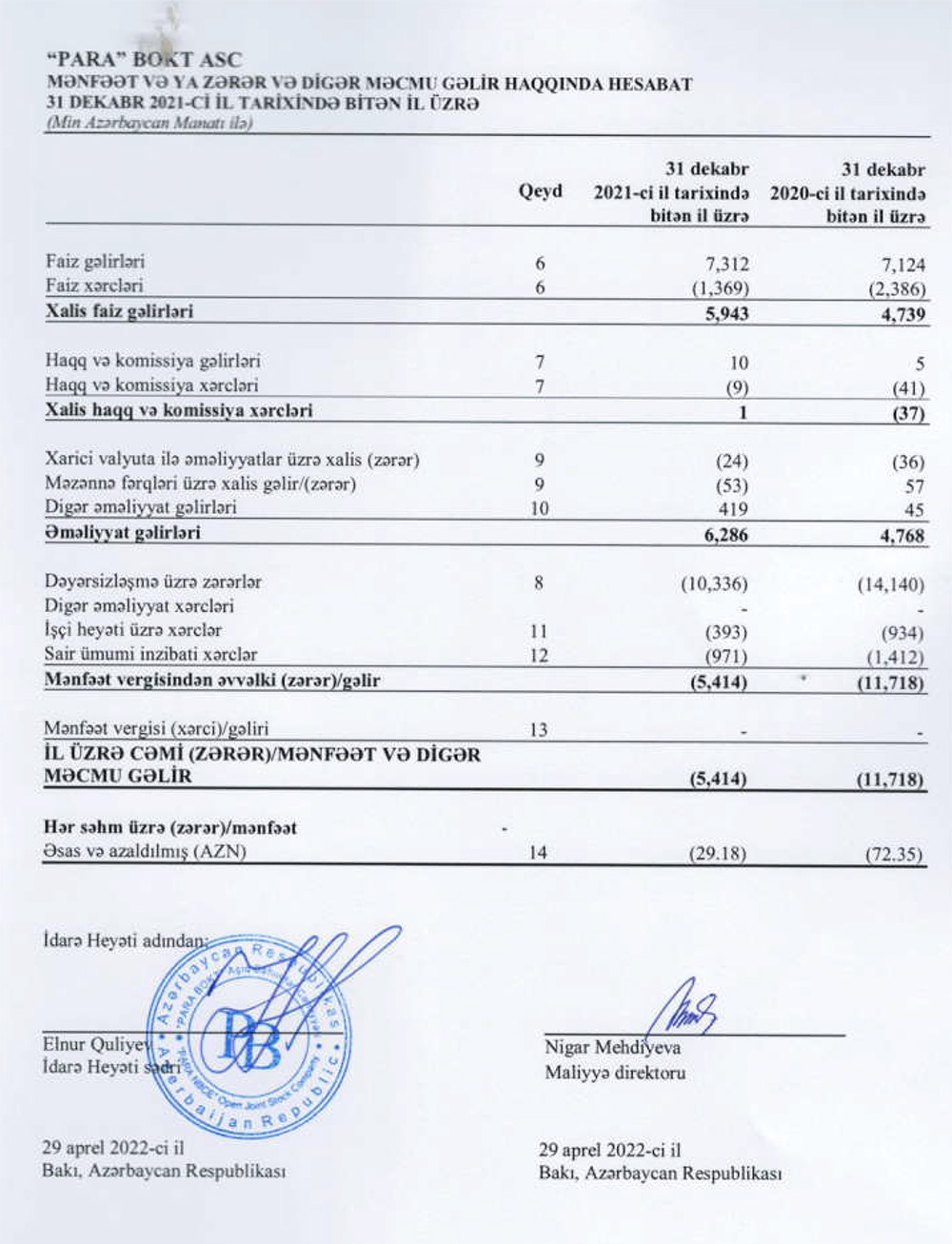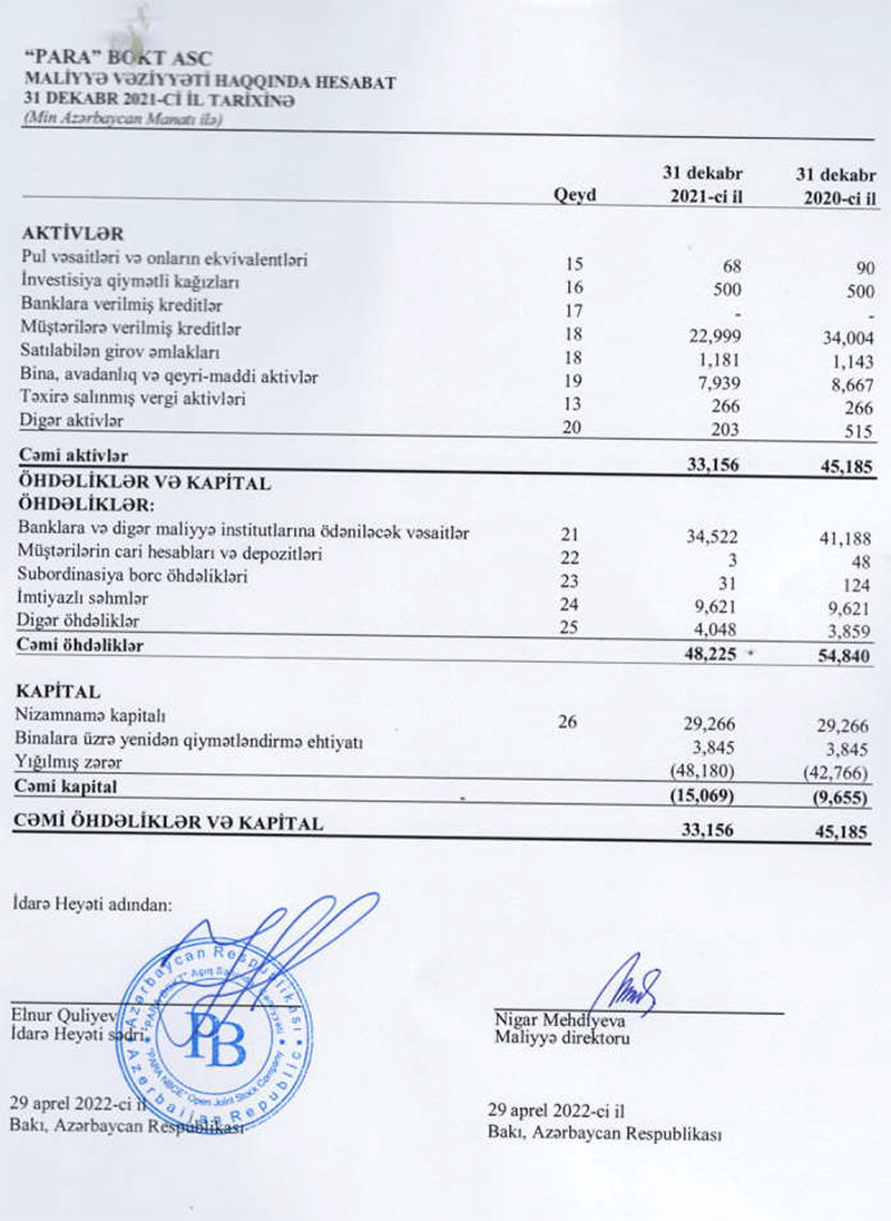 "PARA" BOKT ASC 2021-ci ili 5 milyon 414 min manat xalis zərər ilə başa vurub. ASC 2020-ci ili 11 milyon 718 min manat xalis zərər ilə bağlamışdı. Beləliklə, 2020-ci illə müqayisədə 2021-ci ildə "PARA" BOKT-un xalis zərəri 2,2 dəfə azalıb.