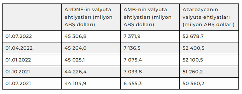 Azərbaycanın valyuta ehtiyatları bu il iyulun 1-nə 52 milyard 678,7 milyon ABŞ dolları təşkil edib.