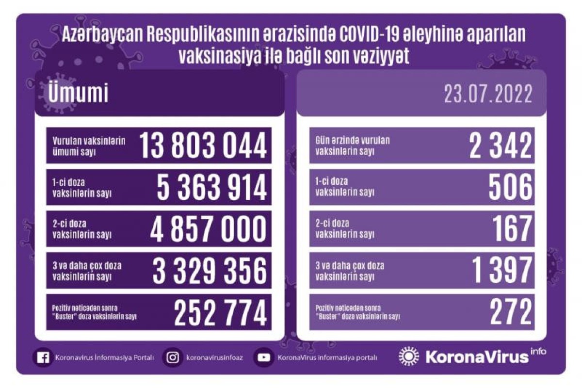 Azərbaycanda son sutkada koronavirus (COVID-19) əleyhinə 2 342 vaksin vurulub.